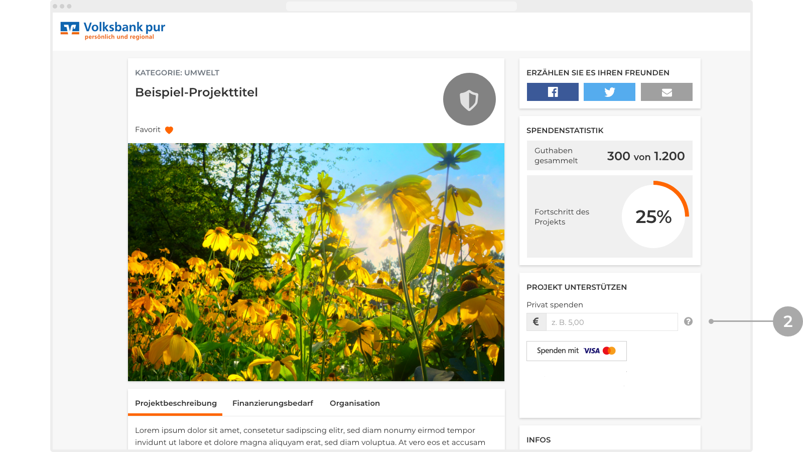Suchen Sie sich ein Projekt von der Projektübersichtsseite aus, das Sie unterstützen möchten. Klicken Sie dazu auf den Button „Projekt ansehen und unterstützen“. Damit gelangen Sie auf die Detailseite des Projekts.